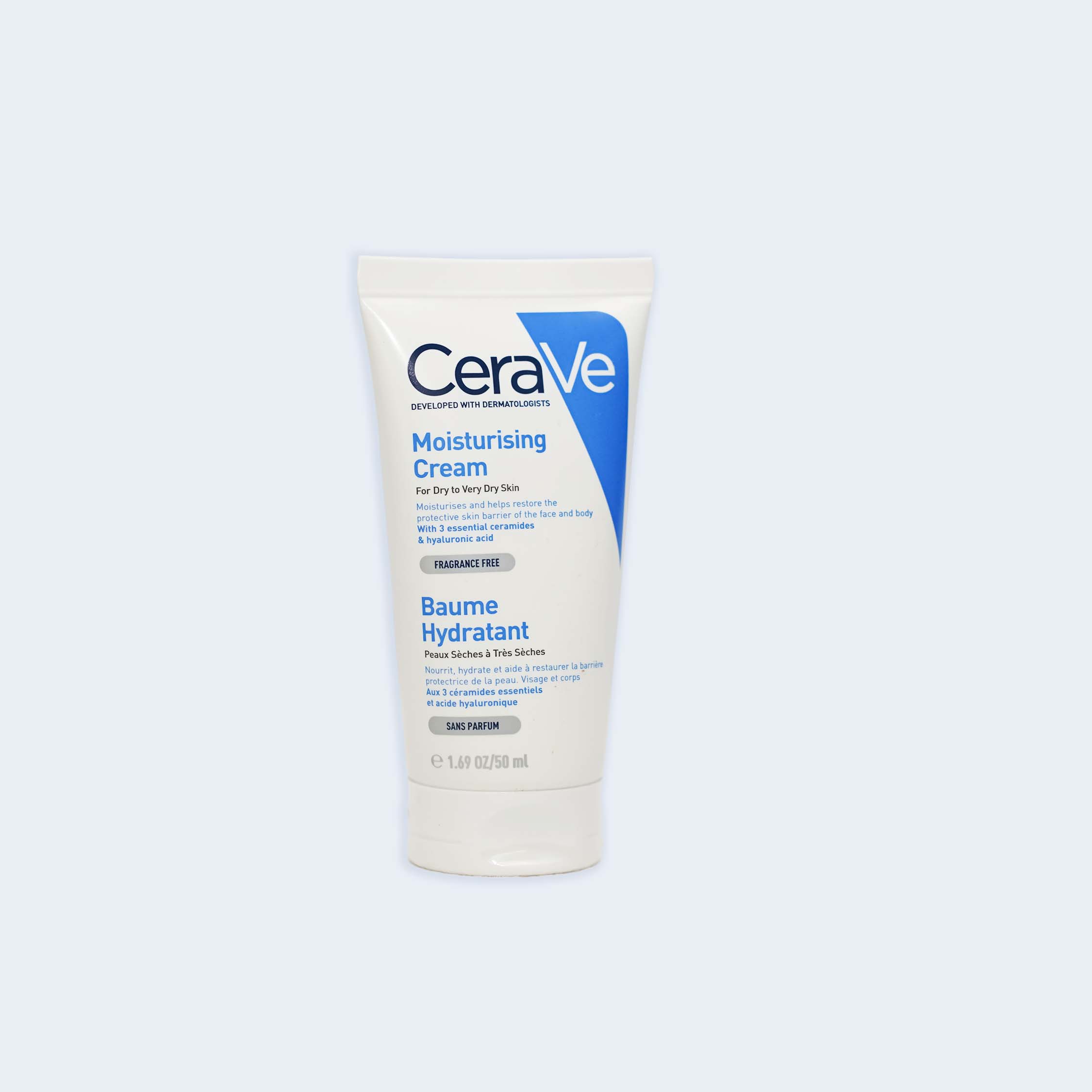 CeraVe Moisturizing Cream is a rich, non-greasy, fast-absorbing moisturizer designed to provide long-lasting hydration for dry to very dry skin on both the face and body. Developed with dermatologists, it combines three essential ceramides and Hyaluronic Acid to help restore the skin’s protective barrier and lock in moisture. Featuring patented MVE Technology, it continuously releases moisturizing ingredients throughout the day for 24-hour hydration. CeraVe Moisturising Cream 50ml for dry to very dry skin, hydrates, restores skin barrier, and provides long-lasting moisture daily.